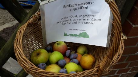 Im Herbst hängen für die Besucher oft Tüten oder Körbe an den Gartenzäunen. Egal ob Birne, Apfel oder Pfaumen: Was bei dem einen im Garten übrig ist, erfreut den anderen für umsonst. Einfach nehmen und genießen.