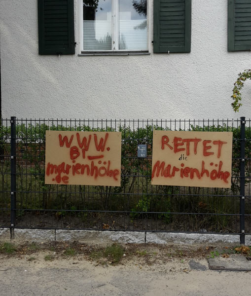 Ob ausgedruckt, laminiert, selbst gepinselt- viele Nachbarn der Marienhöhe bringen seit Gründung der Bürgerinitiative Ihren Unmut zum Ausdruck und protestieren!