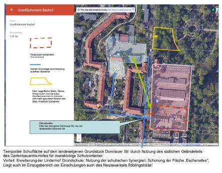 Der südliche Teil, zur Zeit für Ablagerungen von Sand, Steinen, Mulch etc. genutzt, könnte als temporärer Schulstandort entwickelt werden. Der Schulterschluss zur gegenüber liegenden Lindenhof-Schule bietet sich geradezu an!