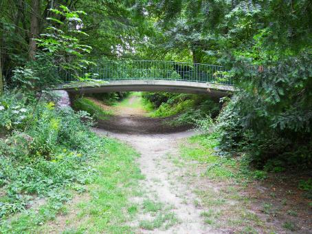 Die Rodelbahn führt von halber Höhe unter der Brücke durch und endet unten auf der Wiese.