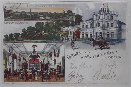 Im nördlichen Bereich gab es wohl schon damals (1875) eine erste Gaststätte mit dem Namen "Gaststätte Marienhöhe von P. Krause", wie eine zeitgenössische Postkartenansicht zeigt, die wir in einem Tempelhof Kalender vor kurzem zufällig entdeckt haben (Danke an Frau Plätke für den Hinweis).