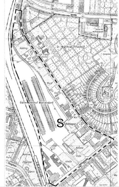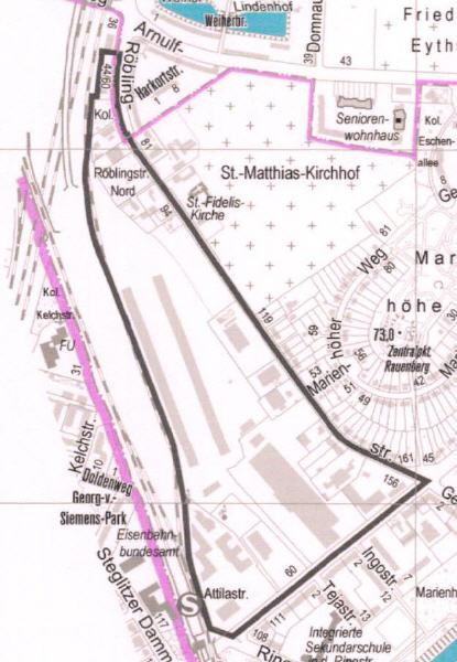 Dieses Gelände gegenüber des Friedhofs gehört zu jenem riesigen Areal, welches durch die bezirkliche Änderung des Flächennutzungsplans von "Gewerbe" in ein sog. "Mischgebiet M2/ Wohnen und Gewerbe" umgeändert wurde.