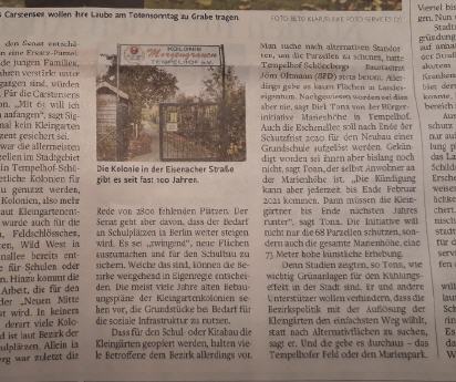 über die anstehende Räumung der Kolonie "Morgengrauen" in der Eisenacher Straße. Dazu im Artikel ein Statement der Bürgerinitiative Marienhöhe zu dem Klimaeffekt der Kleingärten "Eschenallee" auf der Marienhöhe.